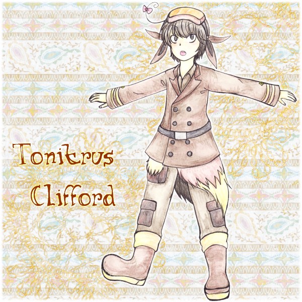 フルネーム:トニトルス=クリフォード(Tonitrus=Clifford) 愛称:トニー 誕生日:7月17日 わんぱくな性格/物音に敏感 アルシェ出身で瑞穂育ち、父親が瑞穂人とアルシェ人のハーフである所謂クオーター。 幼少期はアルシェで過ごしていたが、親の仕事の都合で10歳の頃に瑞穂に移住。 トニーは元々住んでいた所には今も祖父母が暮らしていて、時間を見つけてはアルシェに帰省している。 愛国心はなかなか強い方で、アルシェも瑞穂も両方好き!両方自分の故郷!という考え。 今回の戦争に関しても、「自分の国は自分で守るんだ!」と張り切って赴いている。 祖父が60年前の戦争のことを知っていて、そこで義理の弟を亡くしたらしくトニーが軍に入る事は最後まで大反対していた。 しかし、おじいちゃんっ子の彼にしては珍しく自分の意見を曲げず、ついに祖父の方が折れた。 ただし、「情けない死に方をしたらクリフォード家の墓には入れない」と、釘を刺されている。 実年齢に比べて言動がやや子供っぽい。 お菓子大好き、遊ぶの大好き。 一見悩みがなさそうだが、実は背が低いのを気にしていて、ブーツで5cmばかしごまかしている。 頑張って牛乳を飲んでいたが、残念ながら効果は薄かったようだ。 フィーリングで人にあだ名を付ける変な癖がある。 |